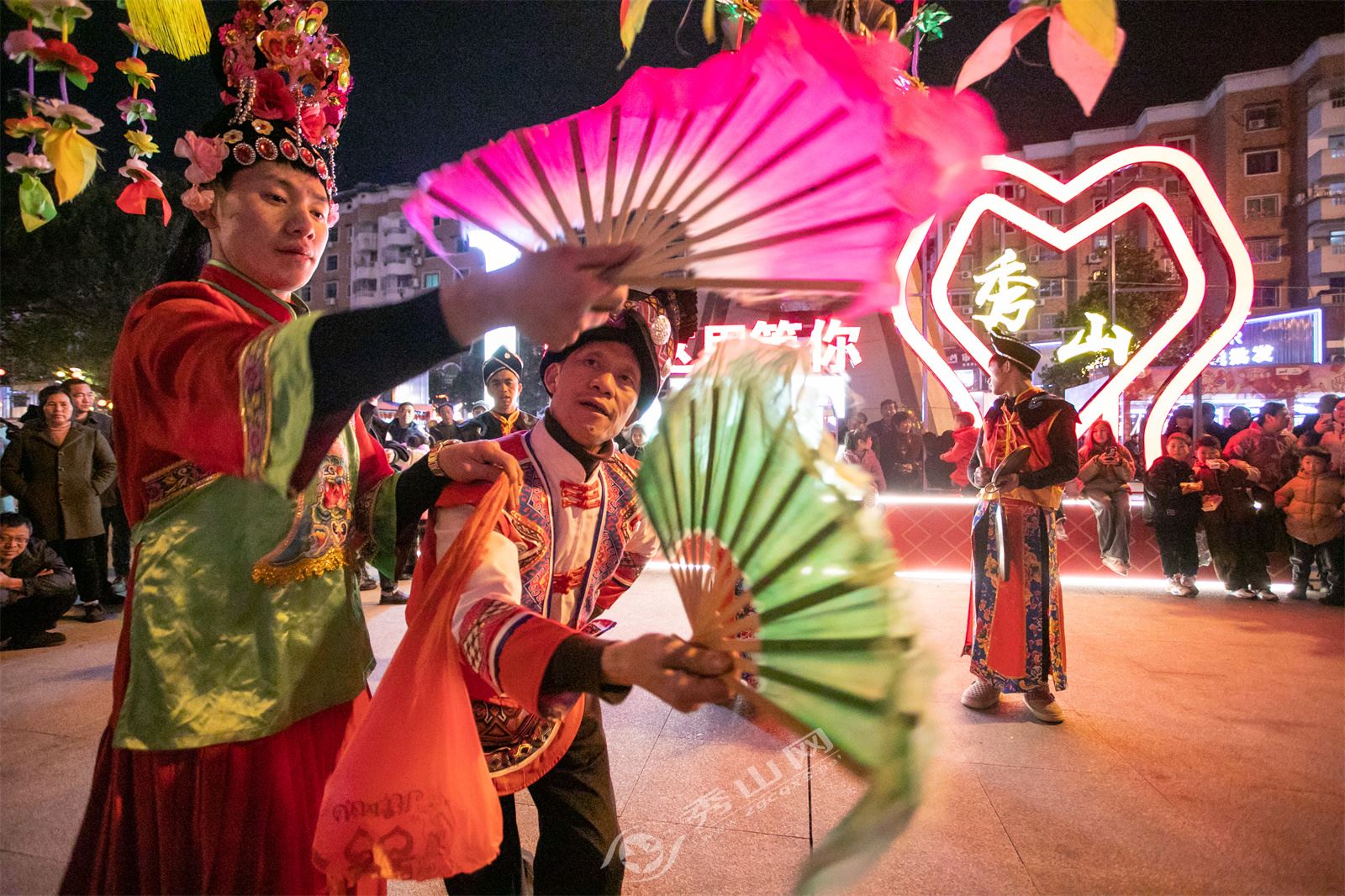 何建勋(右一)带着花灯班在秀山县城进行花灯戏表演。胡程摄