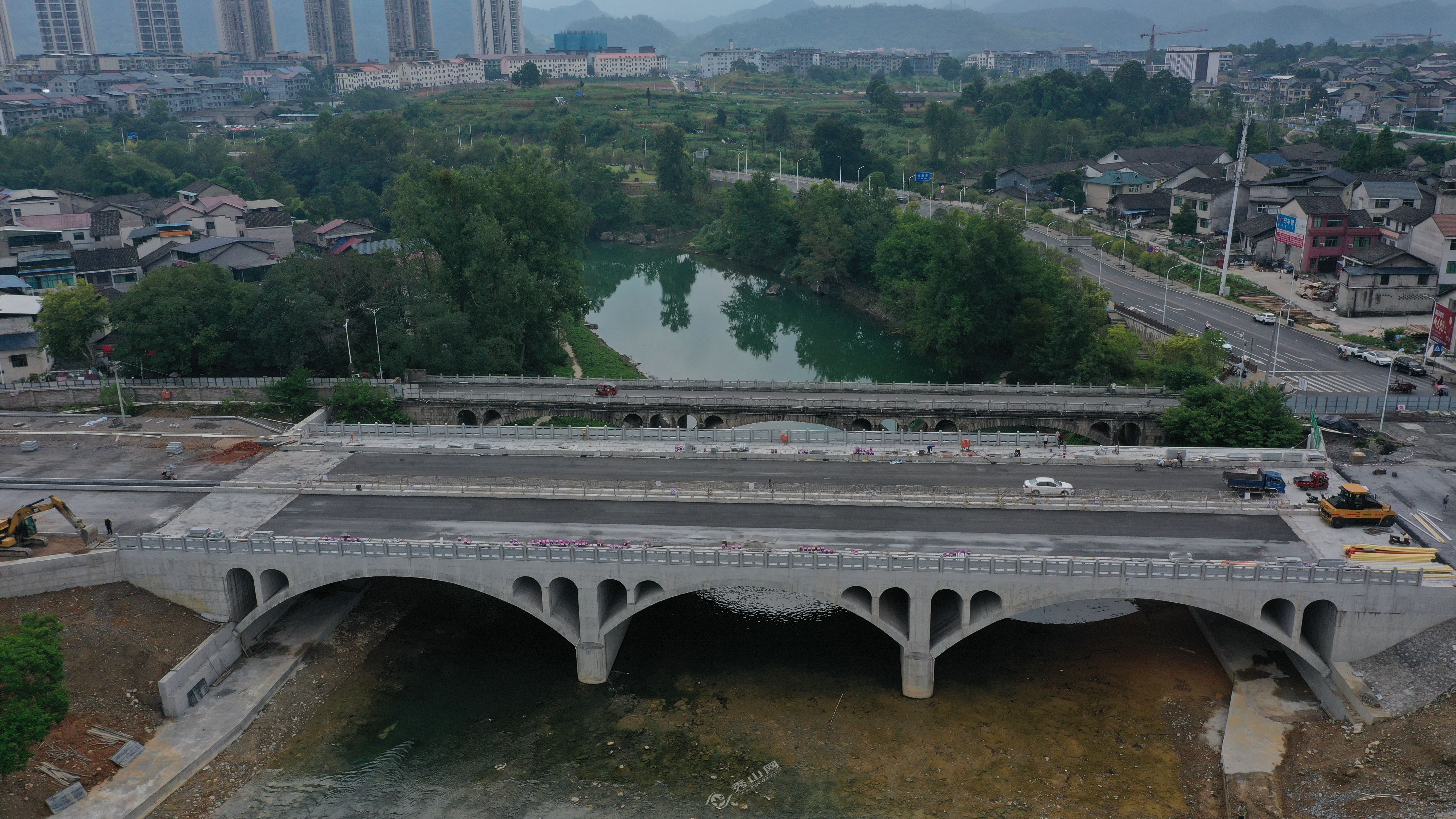 秀山网讯 黄杨大道(石莲路至牛市井段)桥梁工程是该路段的控制性工程。目前,桥拱、桥台主体浇筑施工已实施完毕。8月16日,记者在黄杨大道(石莲路至牛市井段)桥梁工程建设现场看到,20余名施工人员正忙着安装桥面护栏和人行道石板铺装等后续作业,现场一派繁忙。