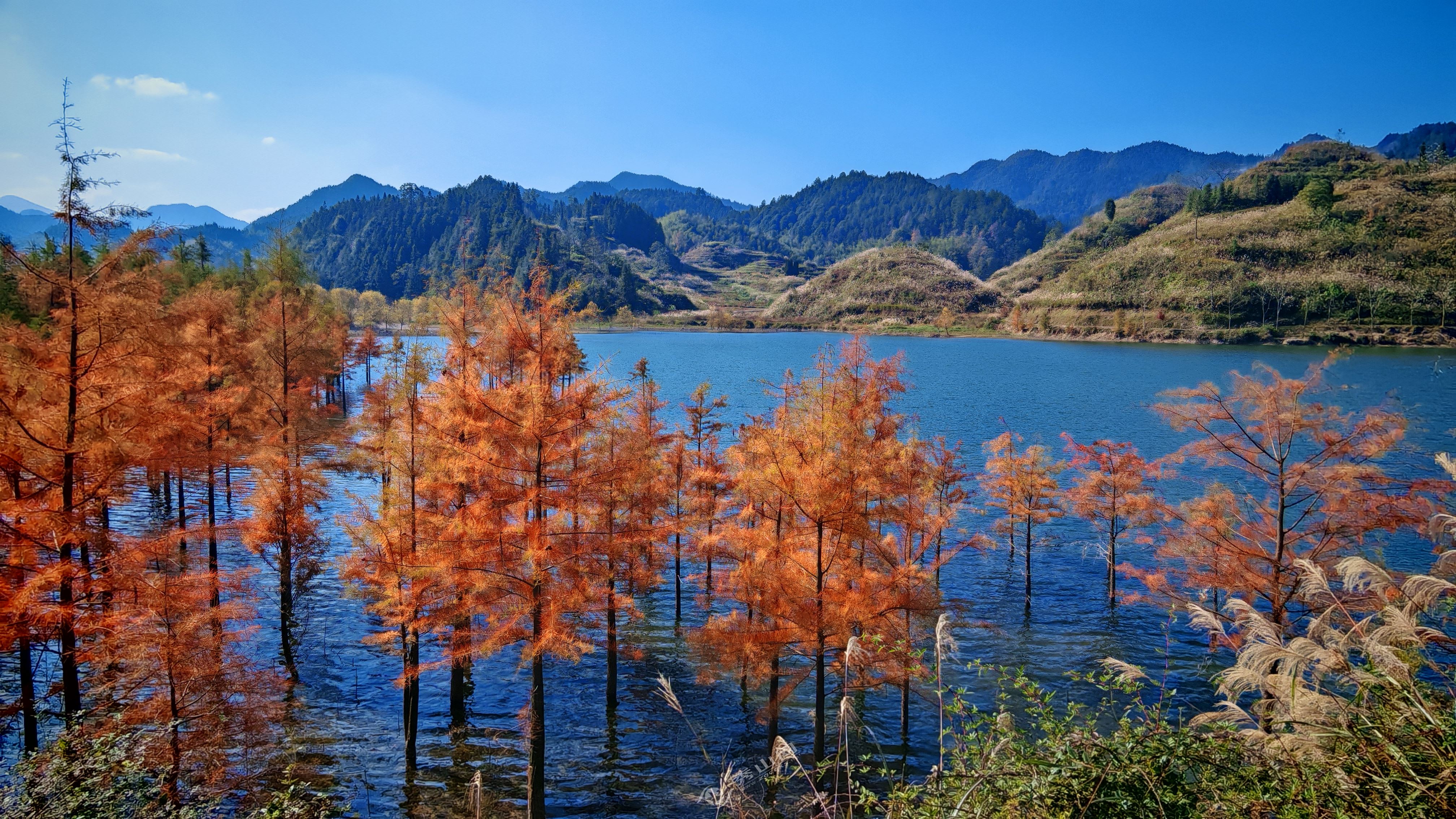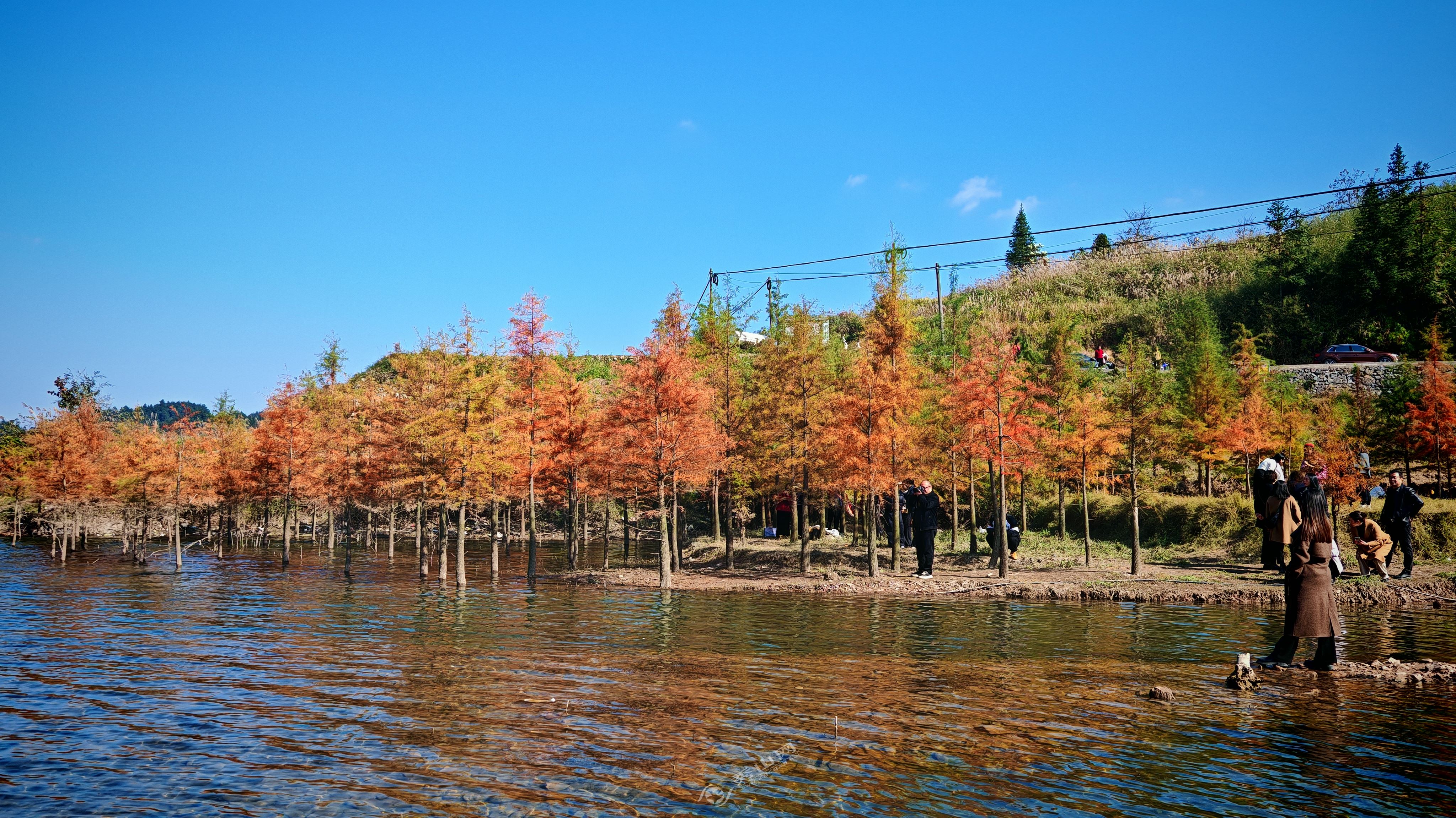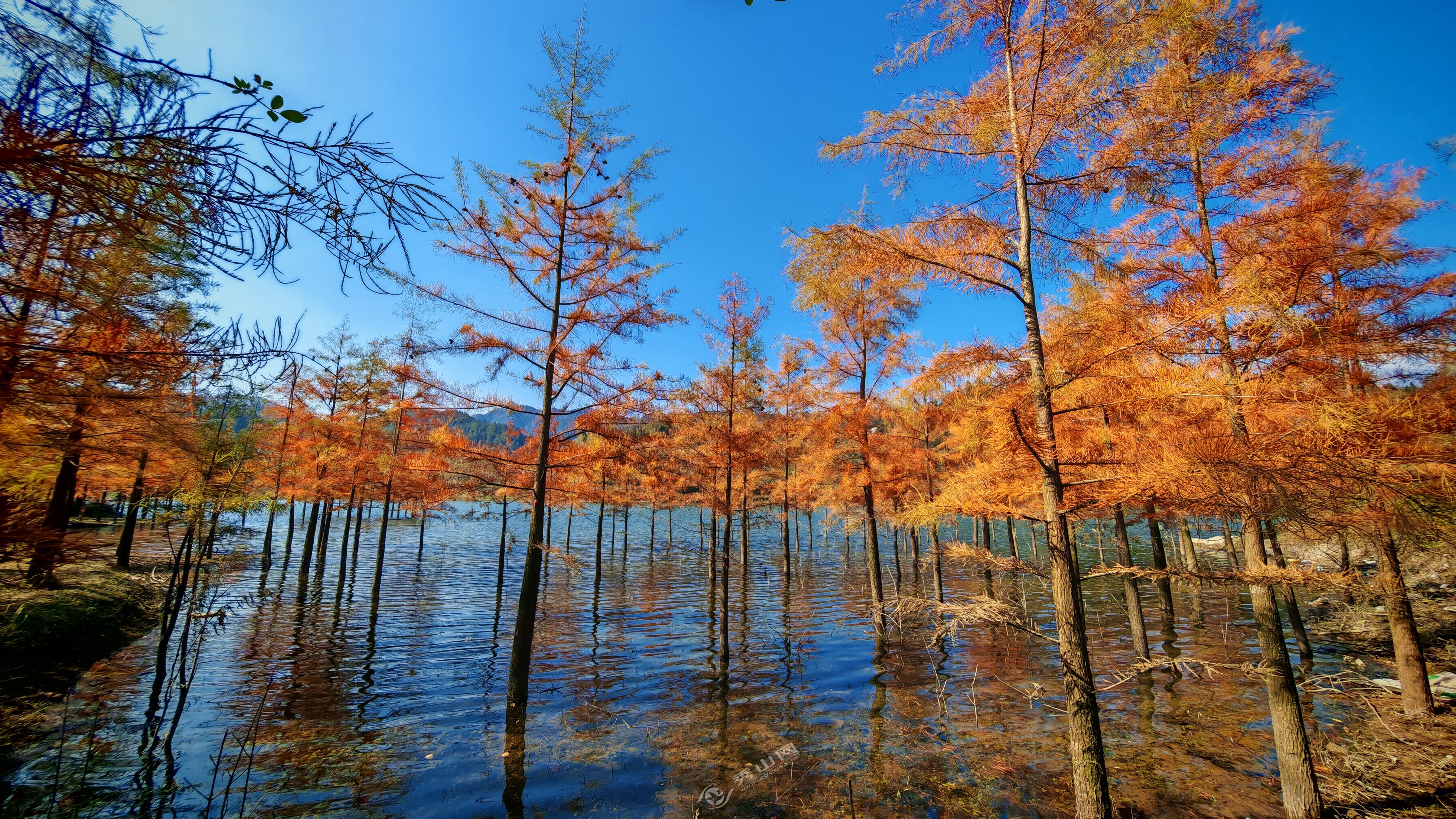 秀山网讯 深秋时节,层林尽染、风景如画。在孝溪水库,生长在库岸或淹没在水中的水杉悄然褪去盛夏苍翠,换上红橙黄绿交织的斑斓盛装,美不胜收。