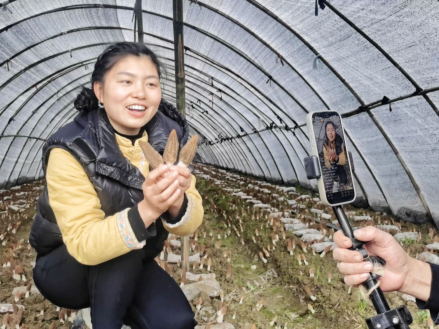 2月25日,兰桥镇新华村羊肚菌种植基地内,种植大户黄明江正与主播联手开展直播带货,羊肚菌从田间到餐桌的“高速通道”瞬间打通,订单实时滚动。大棚里,朵朵羊肚菌破土而出、饱满肥硕、色泽鲜亮。推介声、采摘声交织在一起,一派丰收景象。