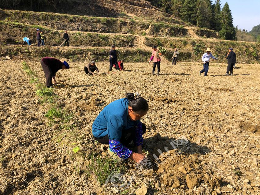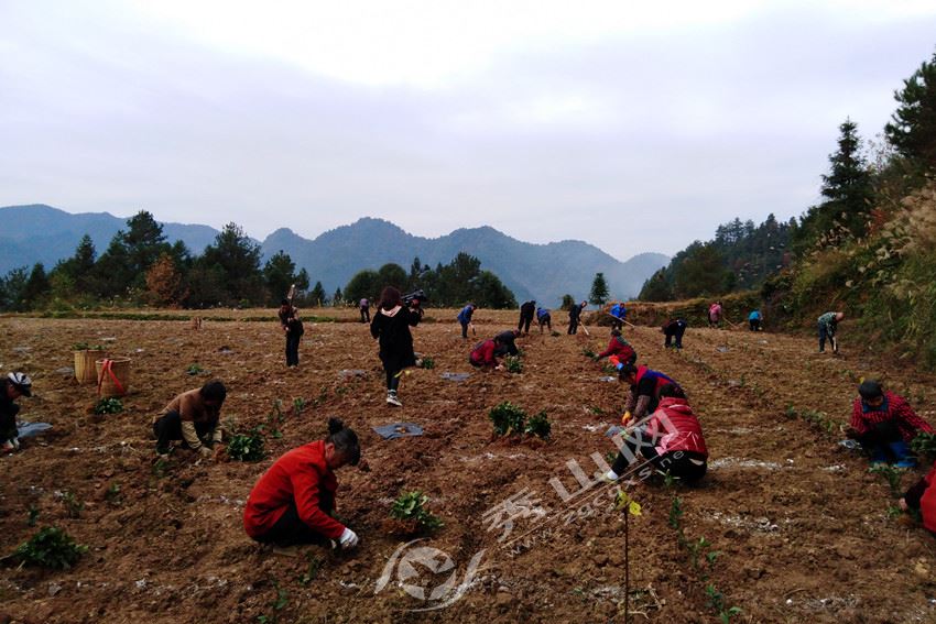日前,记者在该镇石坎村毛叶山桐子基地看到,20余名村民正忙着套种茶叶,挖土、插苗、埋根,一片繁忙的景象。
