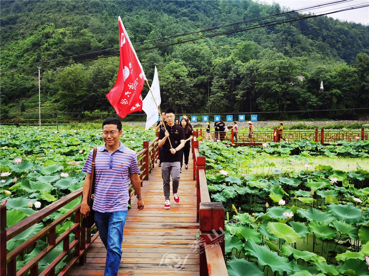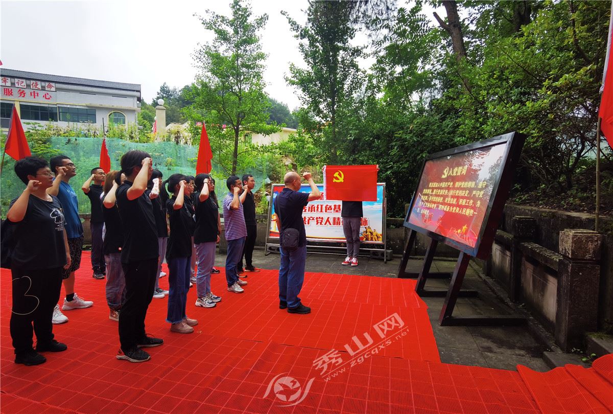 7月19日上午,师生们参观了隘口镇平所村、隘口乡村产业扶贫园等地,详细了解隘口镇脱贫攻坚工作成果及乡村振兴工作。在隘口镇倒马坎红三军战斗遗址,隘口镇工作人员向大家深情讲述了倒马坎战斗事迹和革命精神,为师生们上了一堂生动的党史学习教育课。面向鲜红的党旗,师生们庄严地举起右拳,用铿锵有力的声音,郑重地许下随时为党和人民牺牲一切的铮铮誓言。