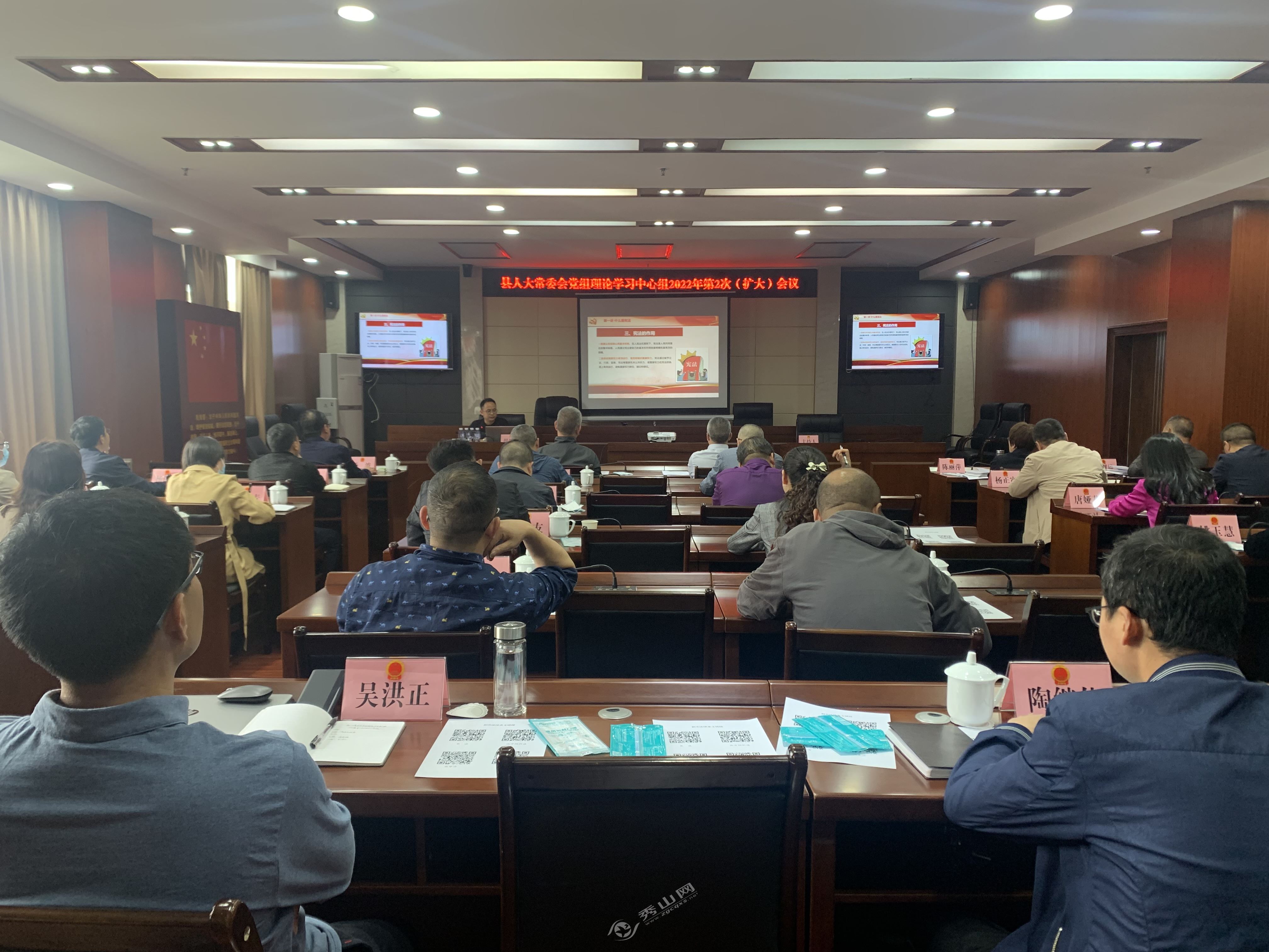 秀山网讯 4月12日,县人大常委会党组理论学习中心组召开2022年第2次(扩大)会议,学习宪法以及人大工作常用法律。县人大常委会党组书记、主任周传明主持会议,县人大常委会副主任陈山鹰、陈丽萍、杨波、龚剑雄出席会议。