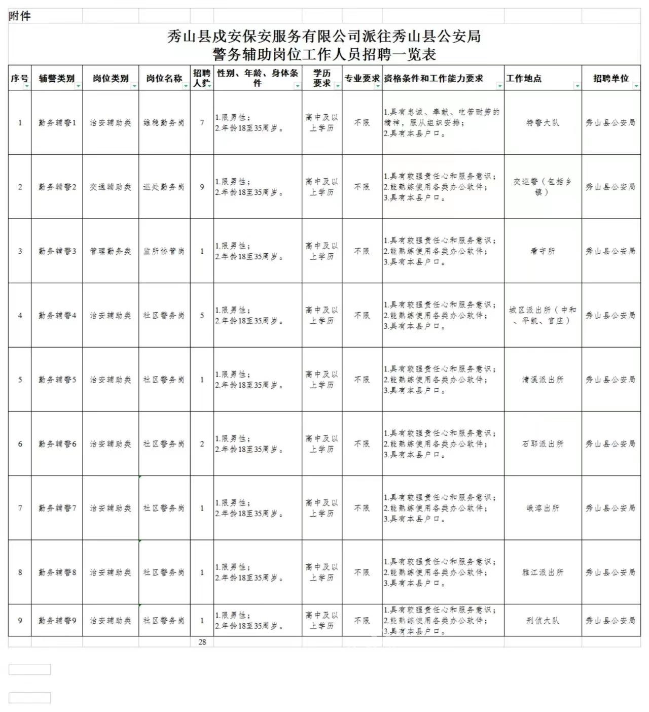 秀山网讯 为满足工作需要,缓解警力紧张压力,秀山县公安局将采用派遣制方式面向社会公开招聘28名辅警。本次招聘的辅警由秀山戍安保安有限公司派往秀山县公安局,从事警务辅助工作。