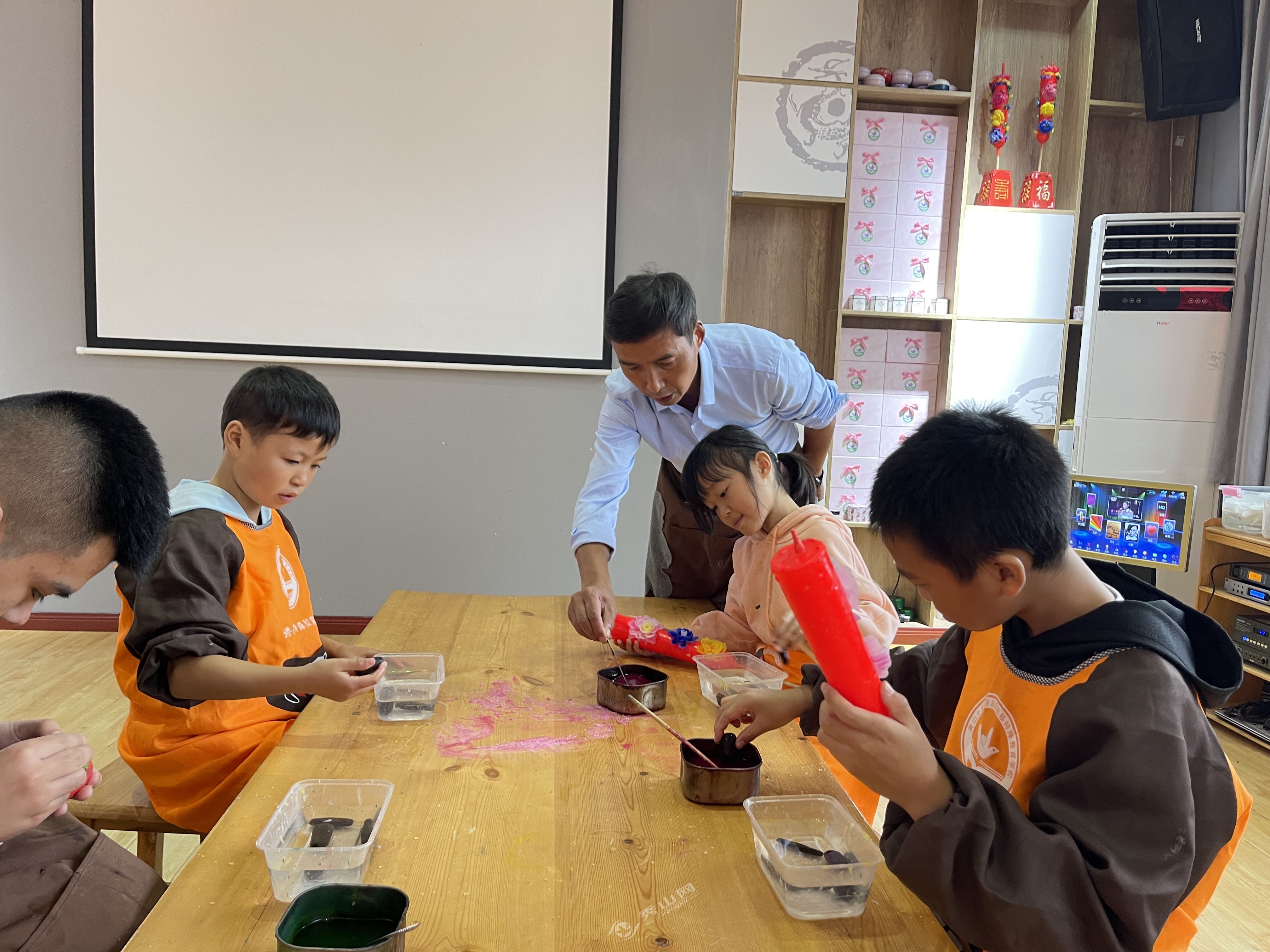近日,在秀山特殊教育学校,秀山龙凤花烛传承人陈建友正在为一群特殊孩子上着龙凤花烛制作课。熔蜡、调色、塑形……每一道工序,陈建友都为孩子们详细讲解。与为正常学生“言传”授课不同的是,陈建友不时需要用手势“身教”,用身体语言,详细为孩子们讲解每一个操作步骤。